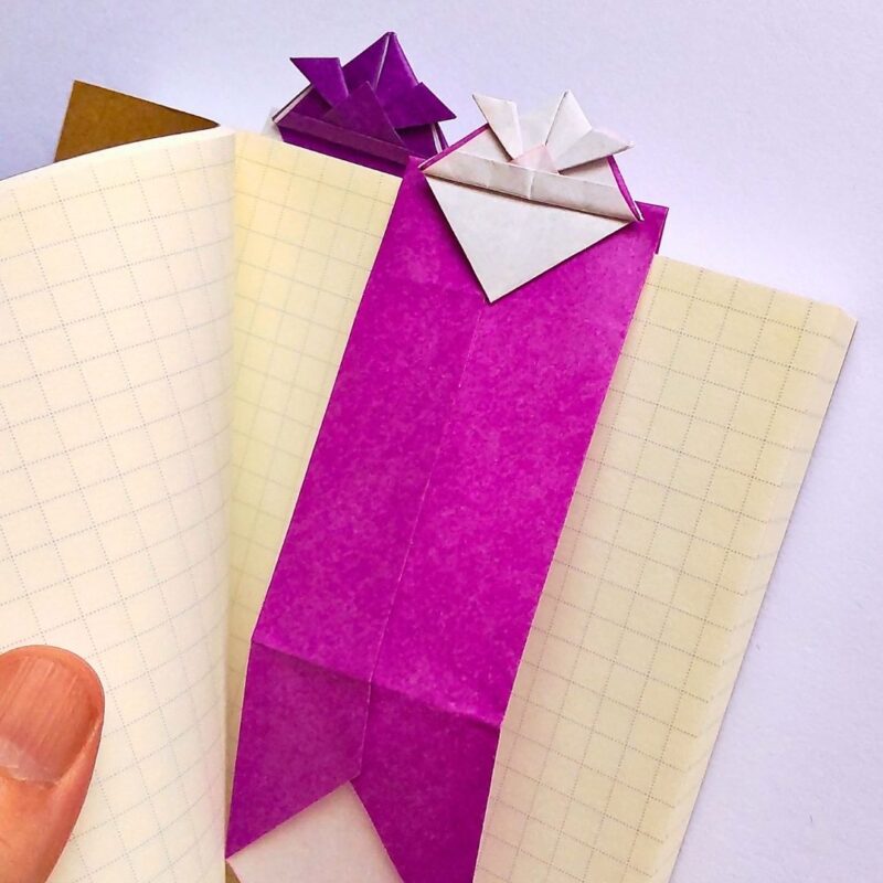 最後に、いつもの鶴の折り方で尾を折らず下に伸ばしたまま、しおりにしました。