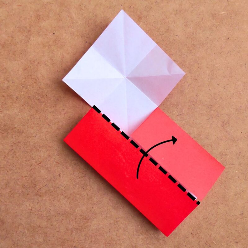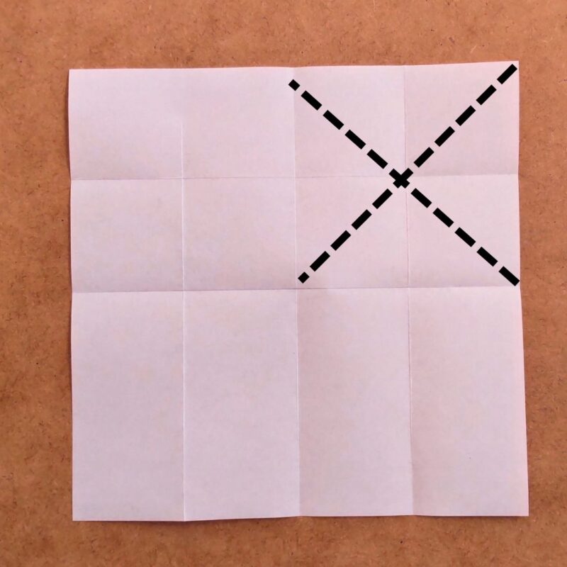 次に右上の四角を斜めに折り目をつけます。