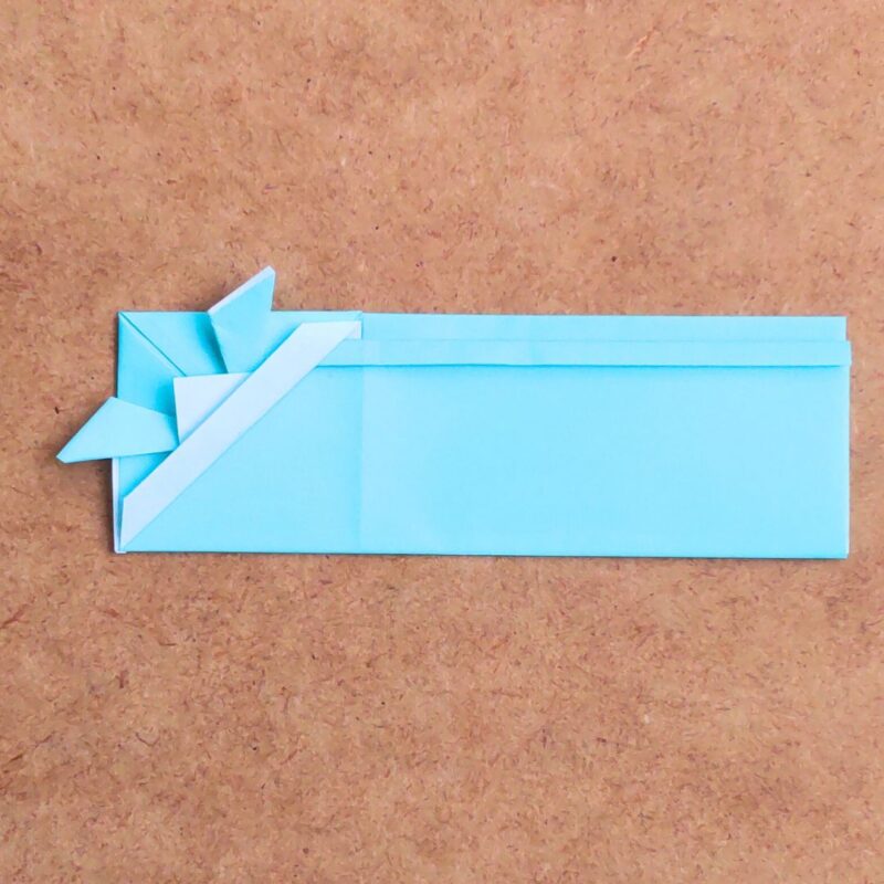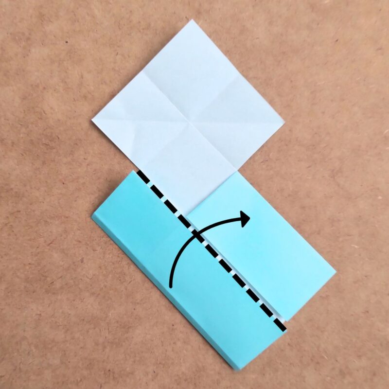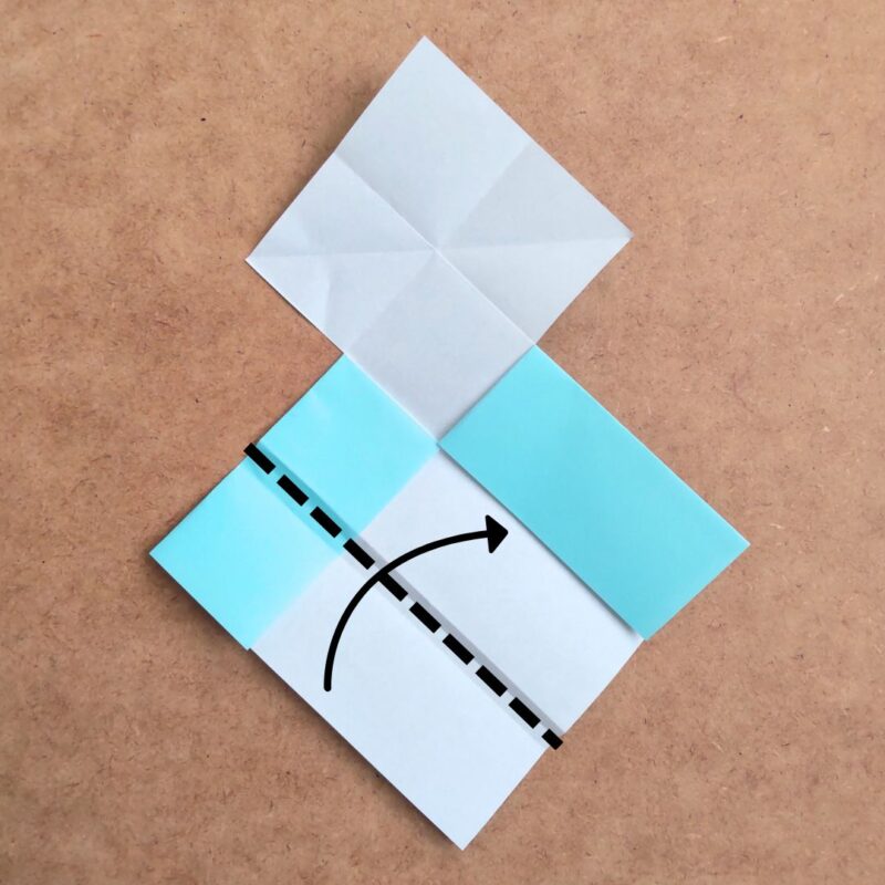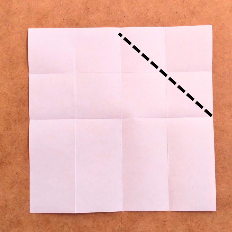 次に右上の四角を斜めに折り目をつけます。