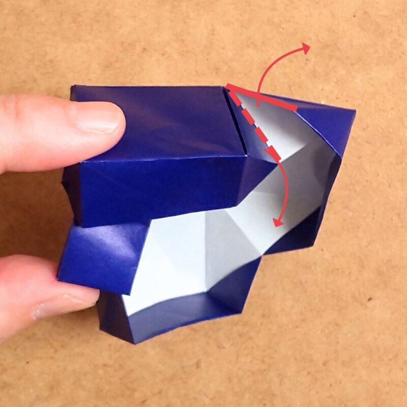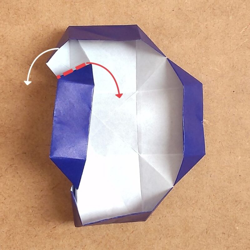まず、点線を内側に折りながら、左側を起こして形を整えます。