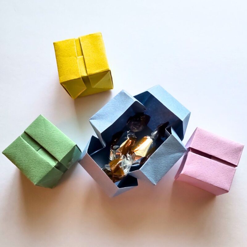 一枚のおりがみで作ることができるクロスボックスは、シンプルでプチギフトにぴったりです。