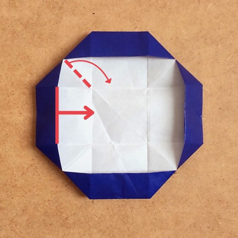 次に、内側に折った点線の外側の上を左にかぶせます。