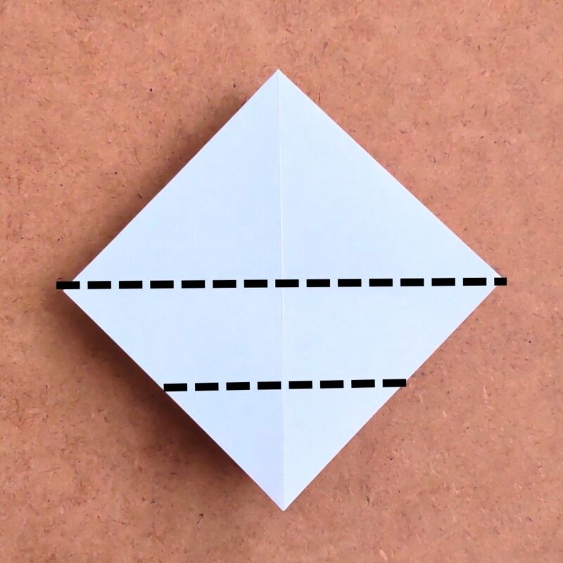 真ん中の折り目に合わせて下の角を折り、さらに真ん中で折ります。