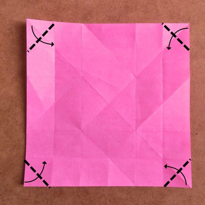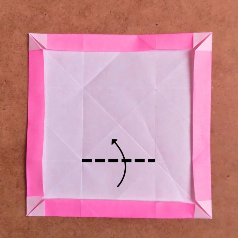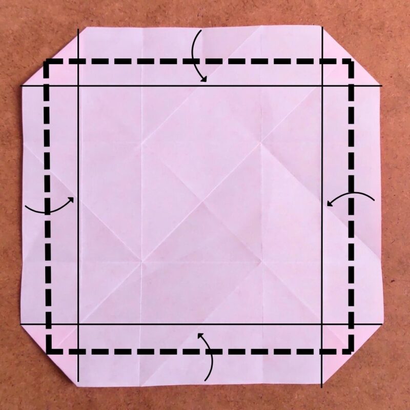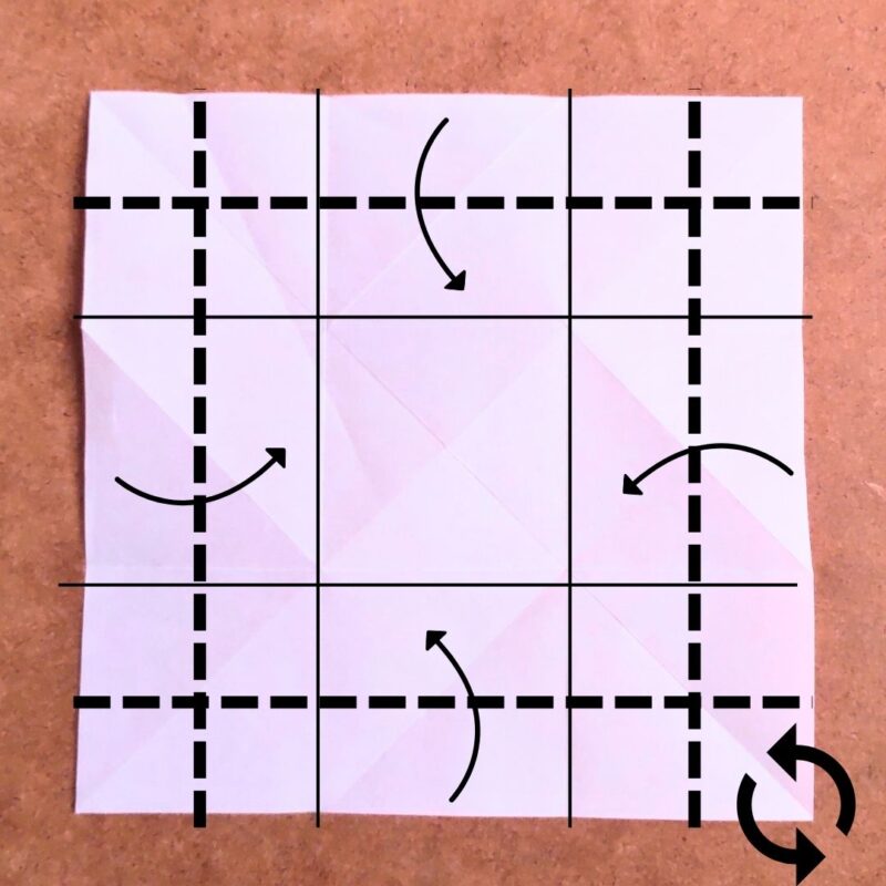真ん中の四角の角と対角線上にある角を合わせて、折り目をつけます。