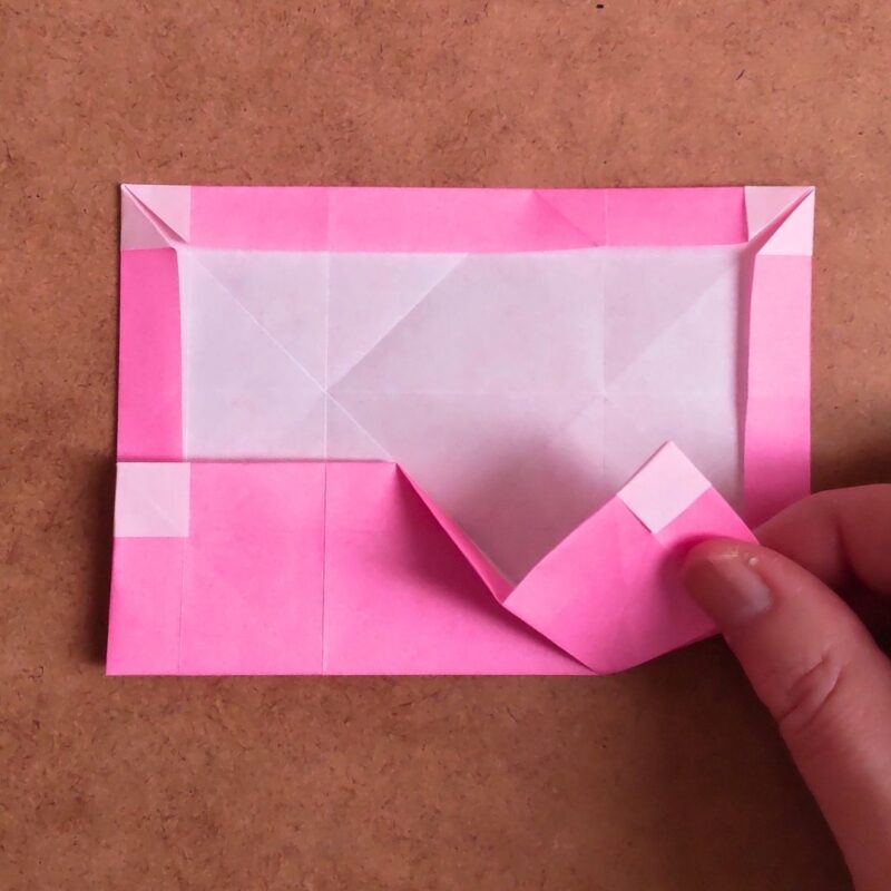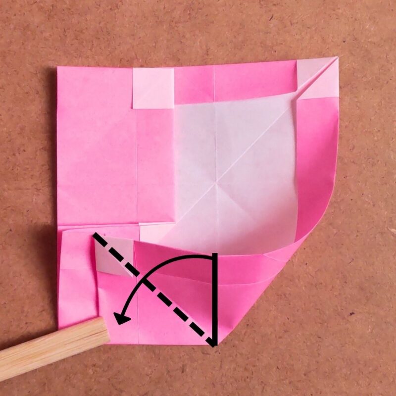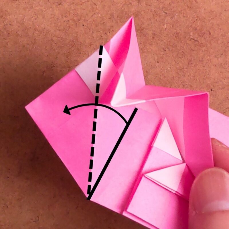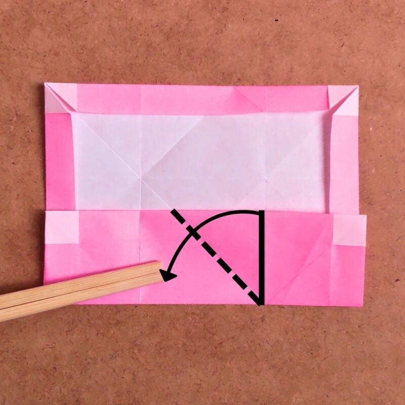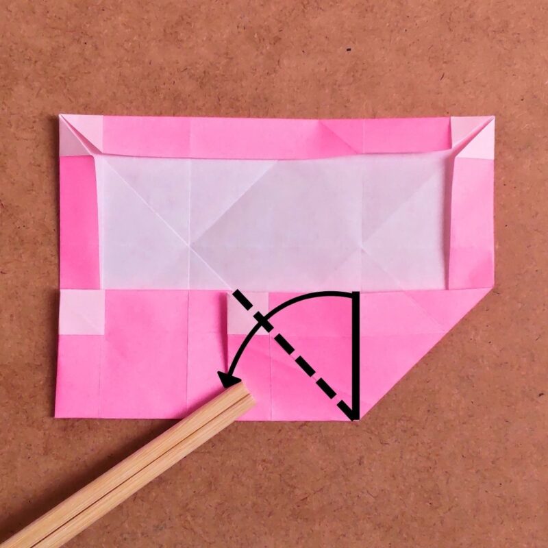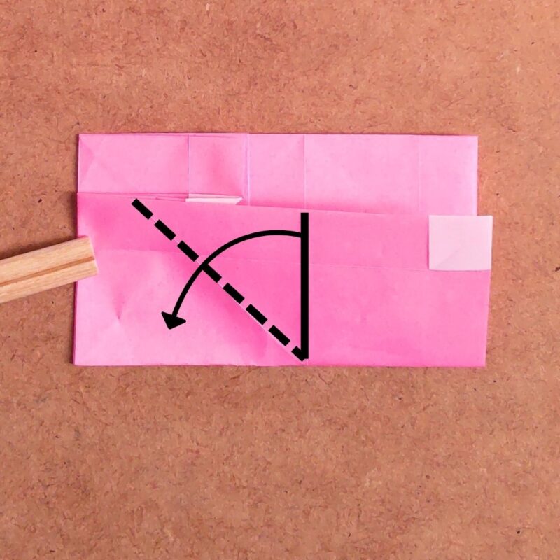 そして、三つ折りした折り目と対角線の交わるところを縦に折ります。